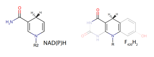実際に、5デアザフラビンの化学式の内部に、NAD+/NADP+の構造が含まれていることが上図から確認出来ます。